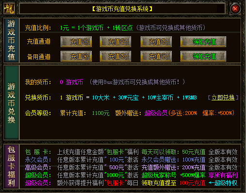 回馈100YSF游戏长期新老玩家支持,特别推出以下游戏返利优惠! 1、任意游戏累计充值达到 1元, 自动加入包服卡会员,每日领取50元真实充值 2、任意游戏累计充值达到 100元,自动加入包服卡会员,永久会员充值额外赠送100% 3、任意游戏累计充值达到 500元,自动加入高级会员,高级会员充值额外赠送200% 4、任意游戏累计充值达到1000元,自动加入超级会员,超级会员充值额外赠送300%,进入所有游戏自动激活超级称号《杀怪爆率+500%》